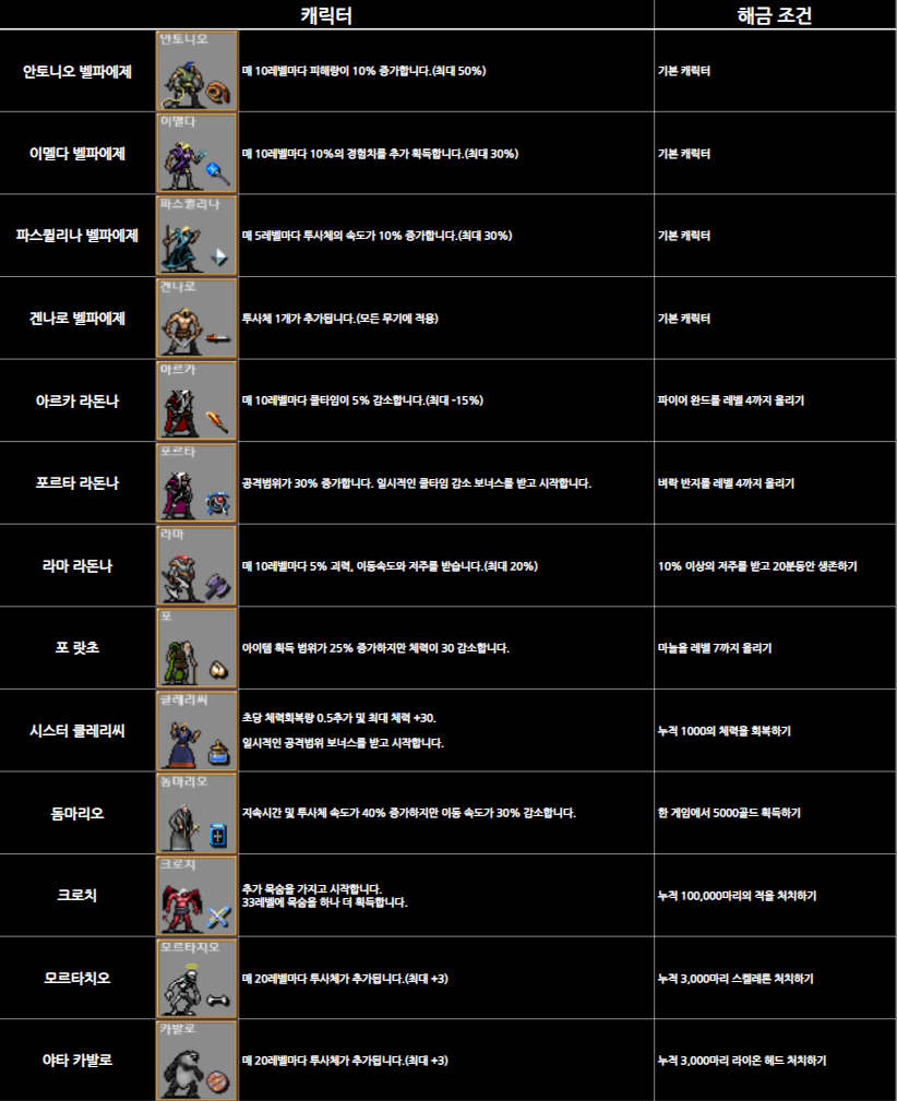 오늘은 뱀파이어 서바이벌의 캐릭터들과 파워업 리스트들을 소개해 드려 보도록 하겠습니다.