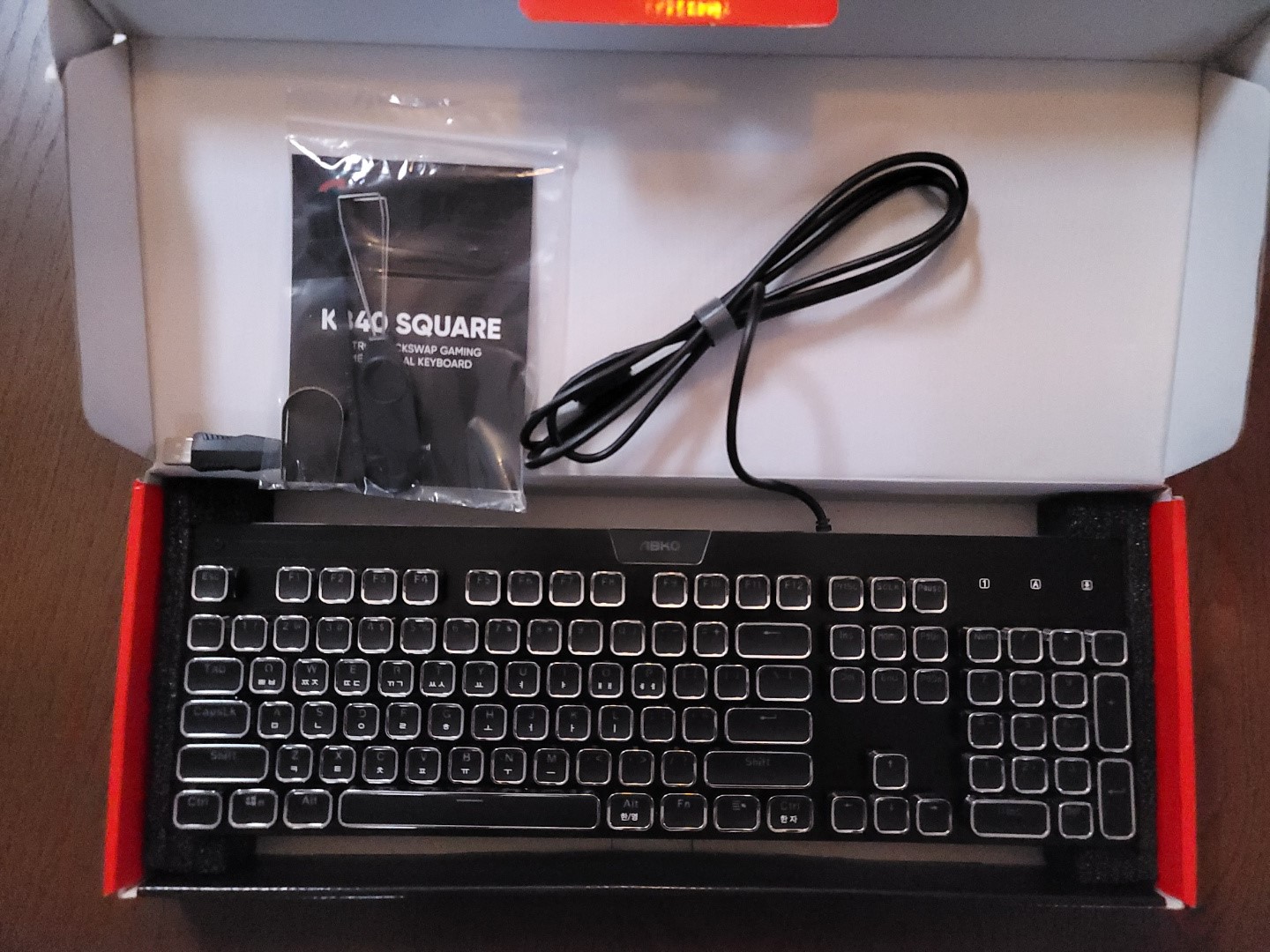 박스를 열면 포장재로 잘 보호된 키보드가 나오면 구성품은 키보드와 메뉴얼, 스위치 교환 장치 및 청소용 솔이 들어 있습니다.