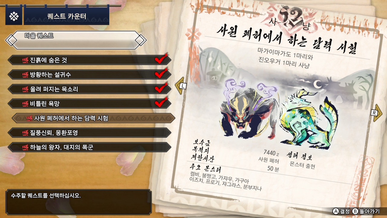 오늘은 몬스터 헌터 라이즈 마을 6성 미션인 사원 폐어에서 하는 담력 시험을 포스팅해보겠습니다.