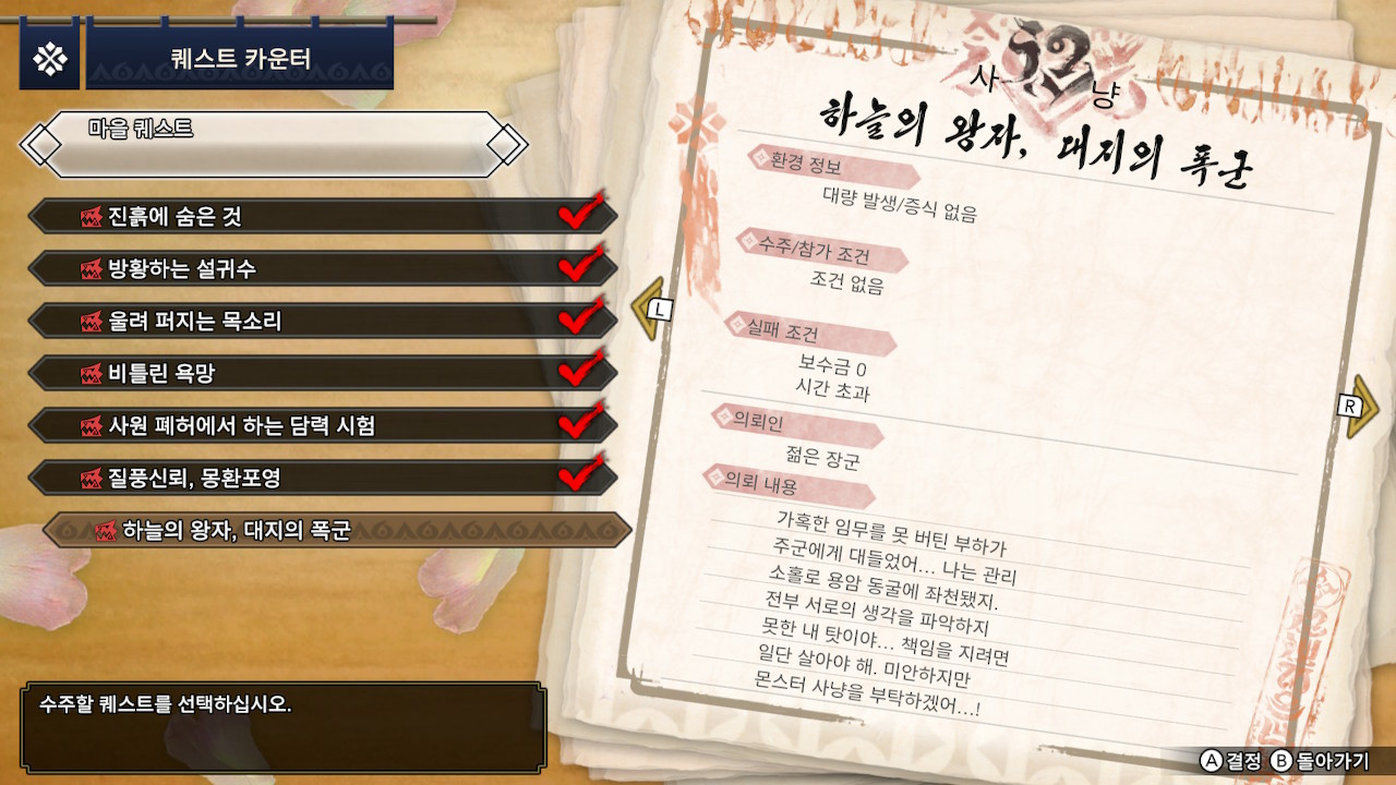 그런데 이번 작은 난이도가 전작보다는 좀 더 쉽고 집회소 미션도 솔플이 가능하다는 평이 많고, 무엇보다 마을에서는 볼 수 없는 몬스터들이 궁금하기도 해서 집회소 퀘스트를 진행해 보기로 했습니다.