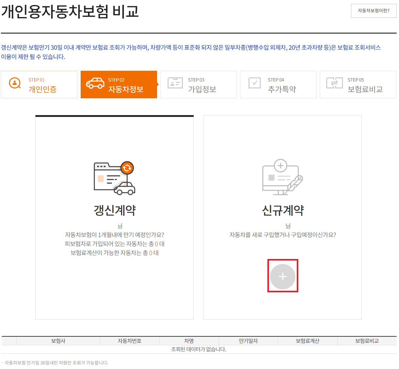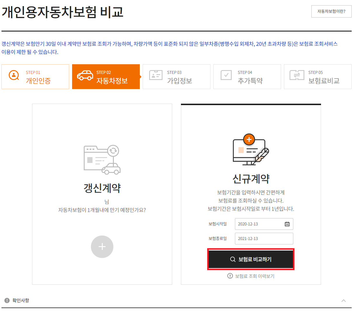 신규계약을 눌러보면 보험 시작일과 종료일이 나오는데 어차피 비교 목적이니 오늘 날짜를 입력하겠습니다.