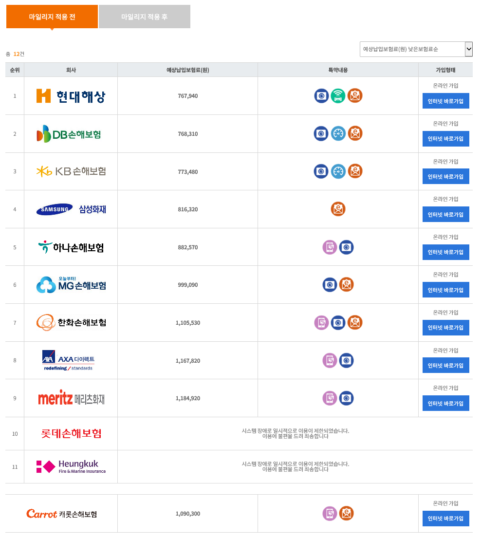 서버가 좀 불안정하다는 단점을 제외하면 첫차 구매나 첫 보험가입 생각하시는 분들께는 괜찮은 사이트 같습니다.
