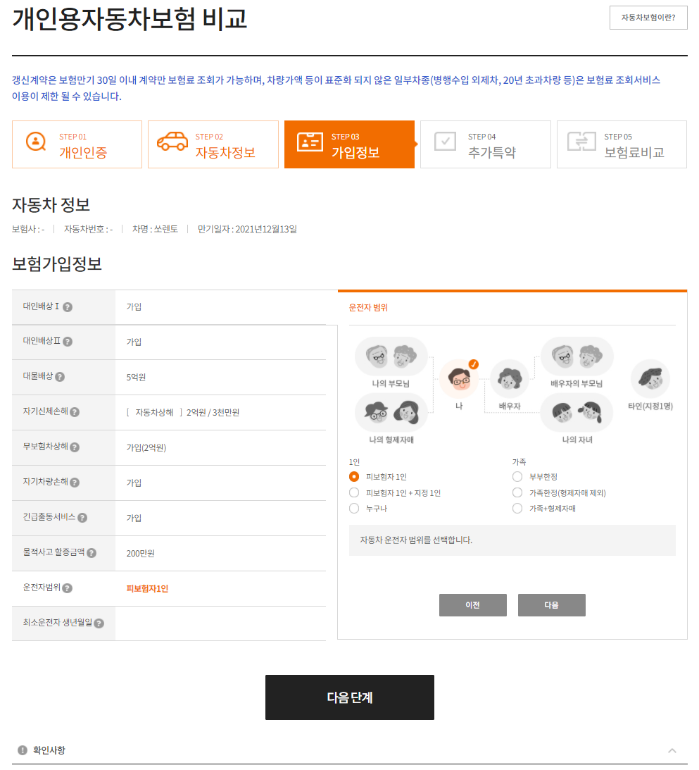 저는 보험료가 쎄게 나올 것 같아 피보험자 1인으로 일단 알아보겠습니다. 나중에 다른 사람이 운전할 일 있으면 일일 보험을 들든가 할 생각입니다.