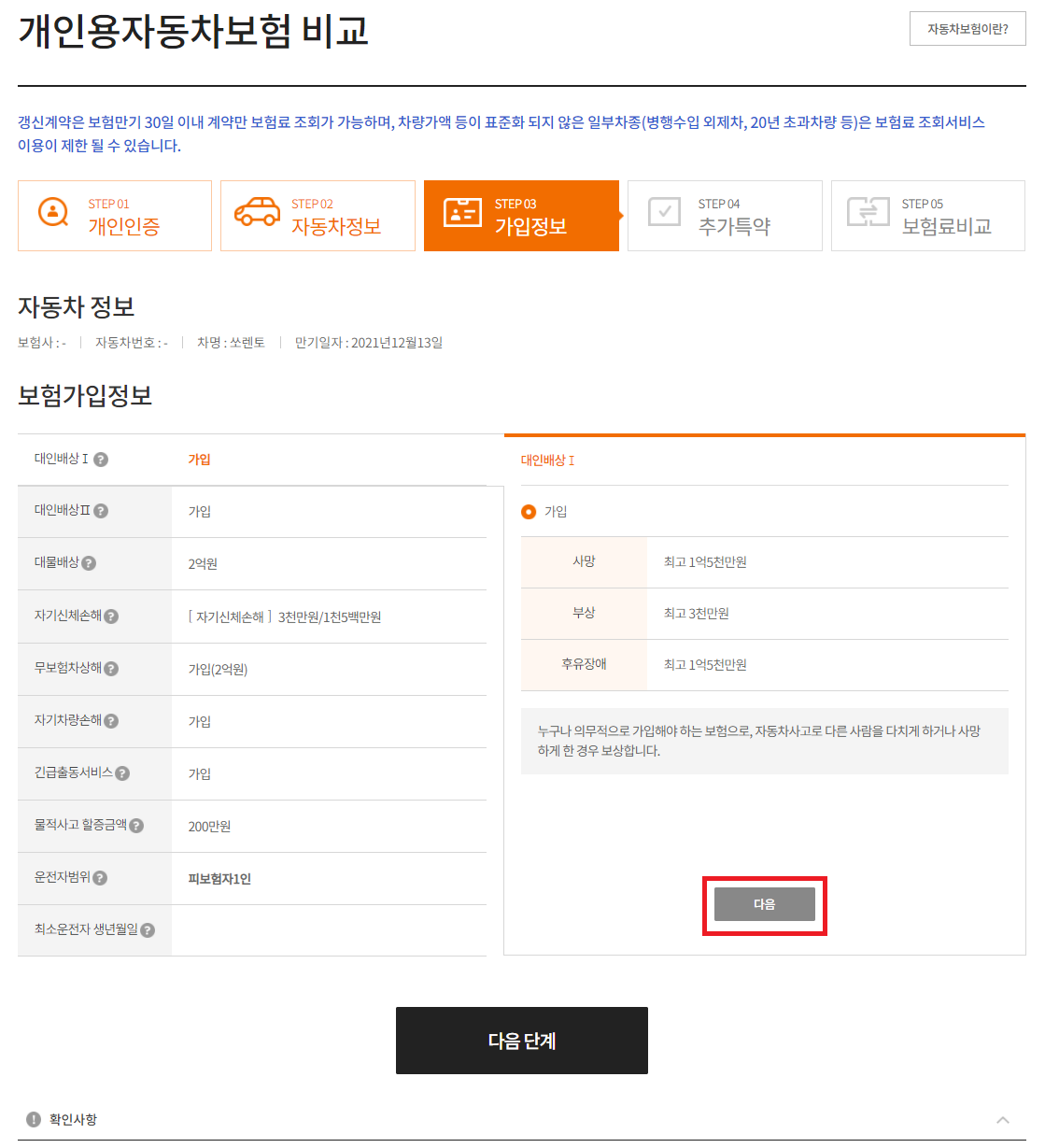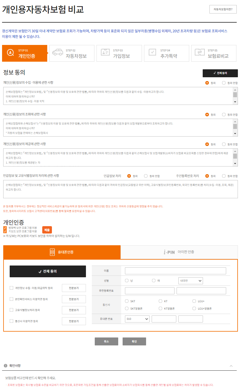 1단계는 개인정보 수집 동의하는 항목이네요. 나중에 보험사에서 전화 올 것 같은 불안감이 있지만 그래도 궁금하니 해보도록 하겠습니다.