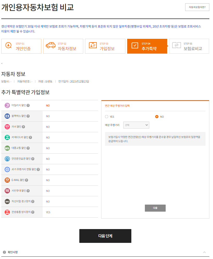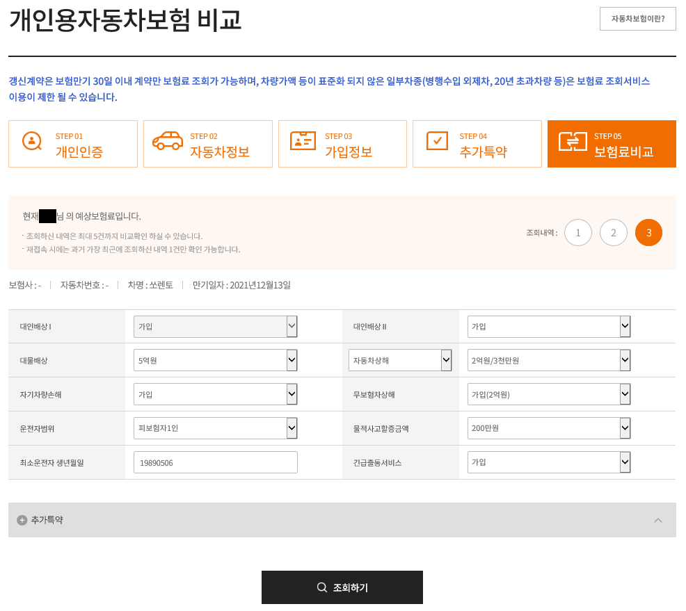 보험가입정보와 추가특약 항목은 바로 수정해서 재검색도 가능합니다.