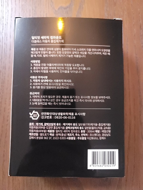 구매한 컴파운드 제품 뒷면에 보니 찌든 때, 물 때, 타르, 벌레 사체까지 제거가 가능하다고 써있습니다.