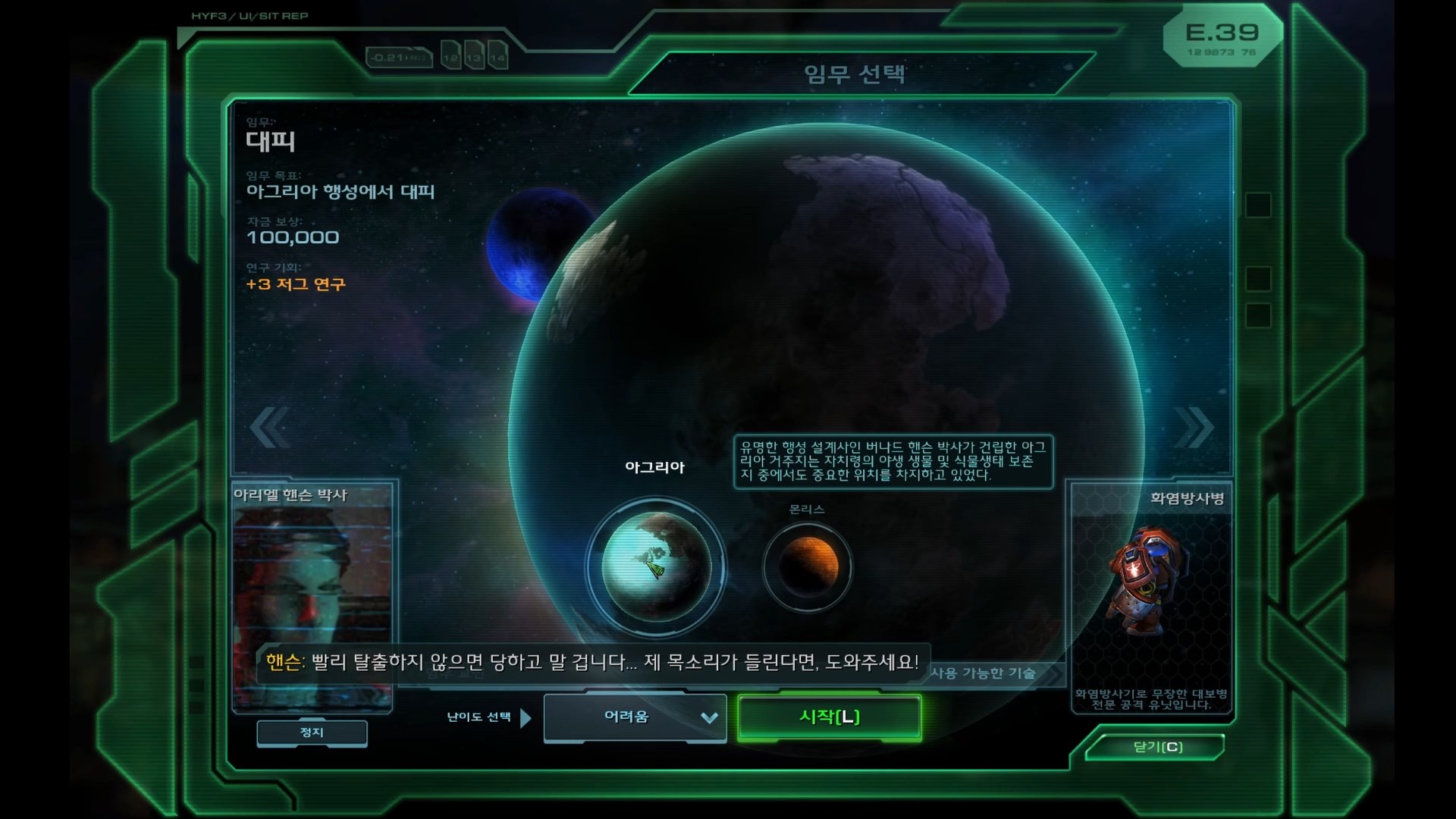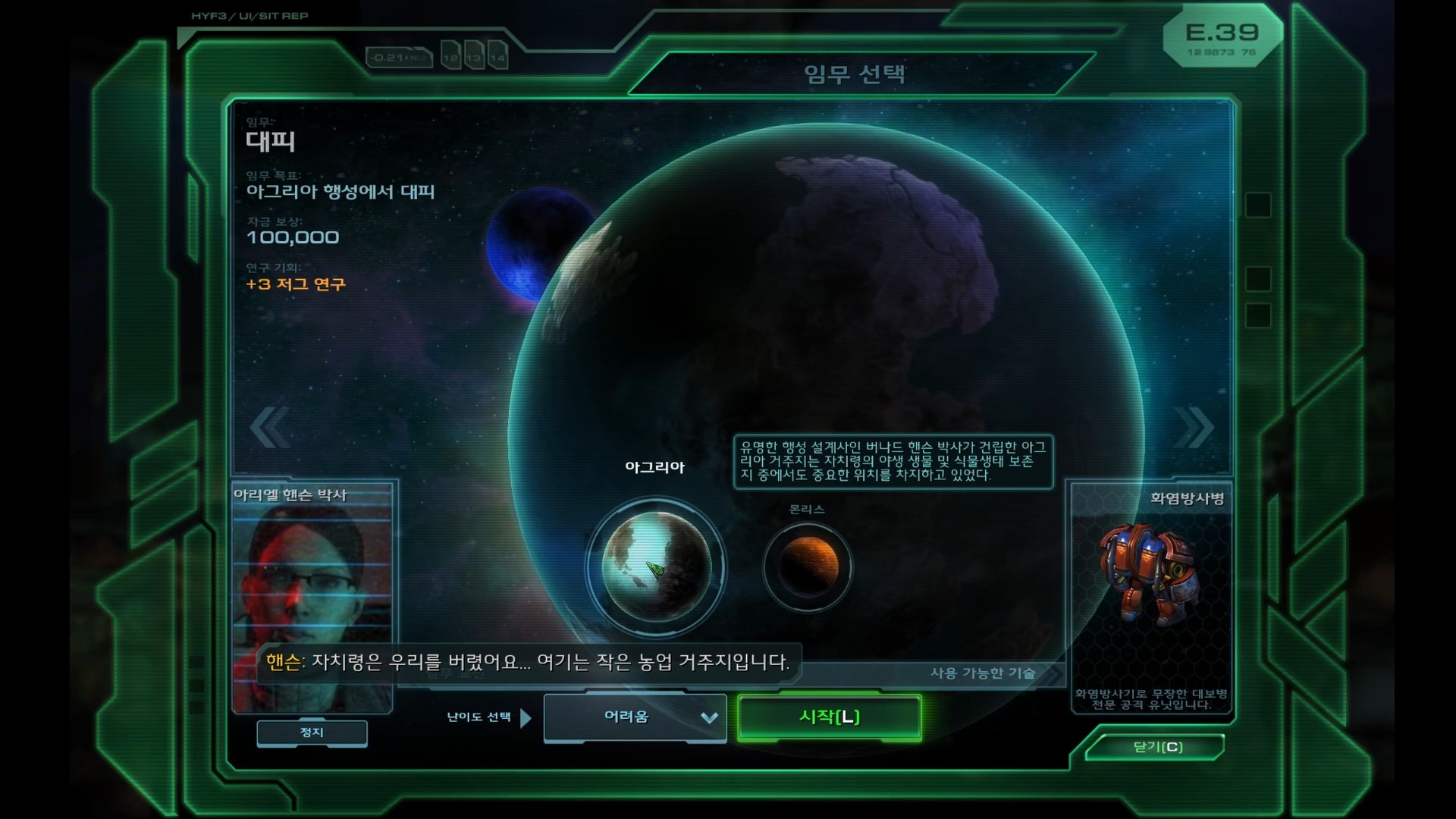 핸슨 : 구조 요청에 응해주셔서 감사합니다! 저는 이곳 아그리아 거주지 주민을 대표하는 아리엘 핸슨 박사입니다.