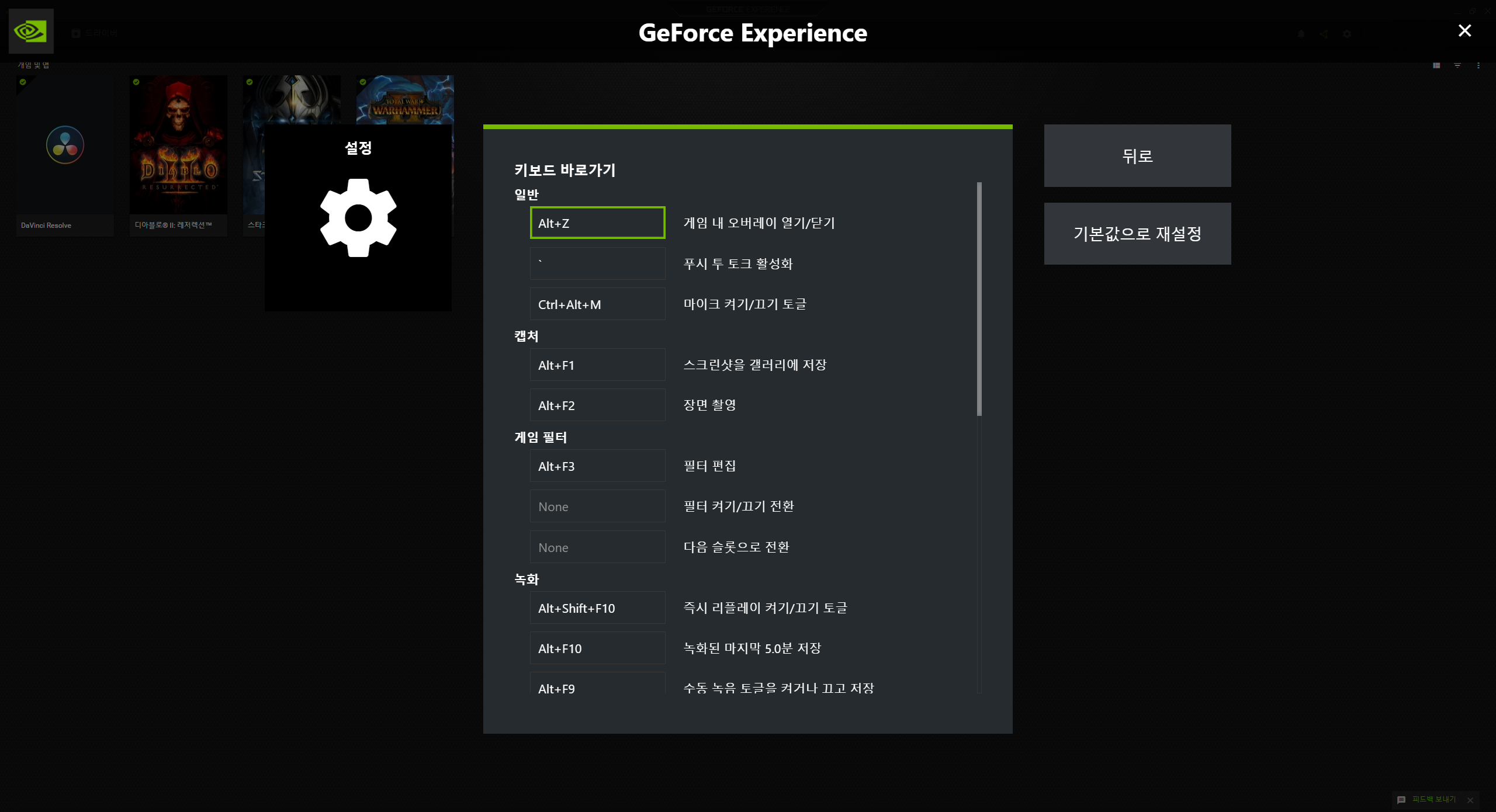 단축키는 X-Box Game Bar 중앙 상단에 있는 설정 메뉴의 바로가기 카테고리에서 변경하실 수도 있습니다.
