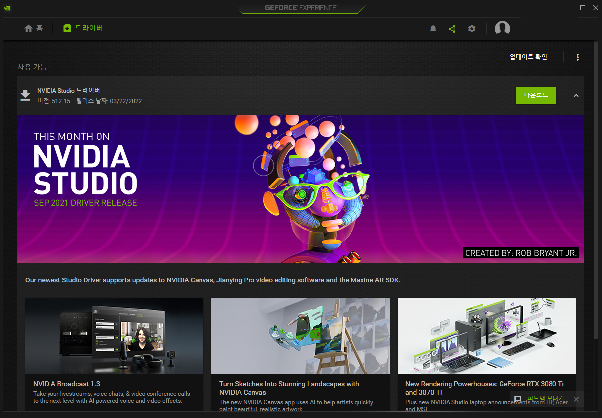 더블클릭해서 실행을 하시면 여러분들이 쓰고 계시는 그래픽 카드의 드라이버 업데이트를 할 수 있는, 그래픽 카드 관련한 엔비디아의 서포트 프로그램이라고 생각하시면 됩니다.