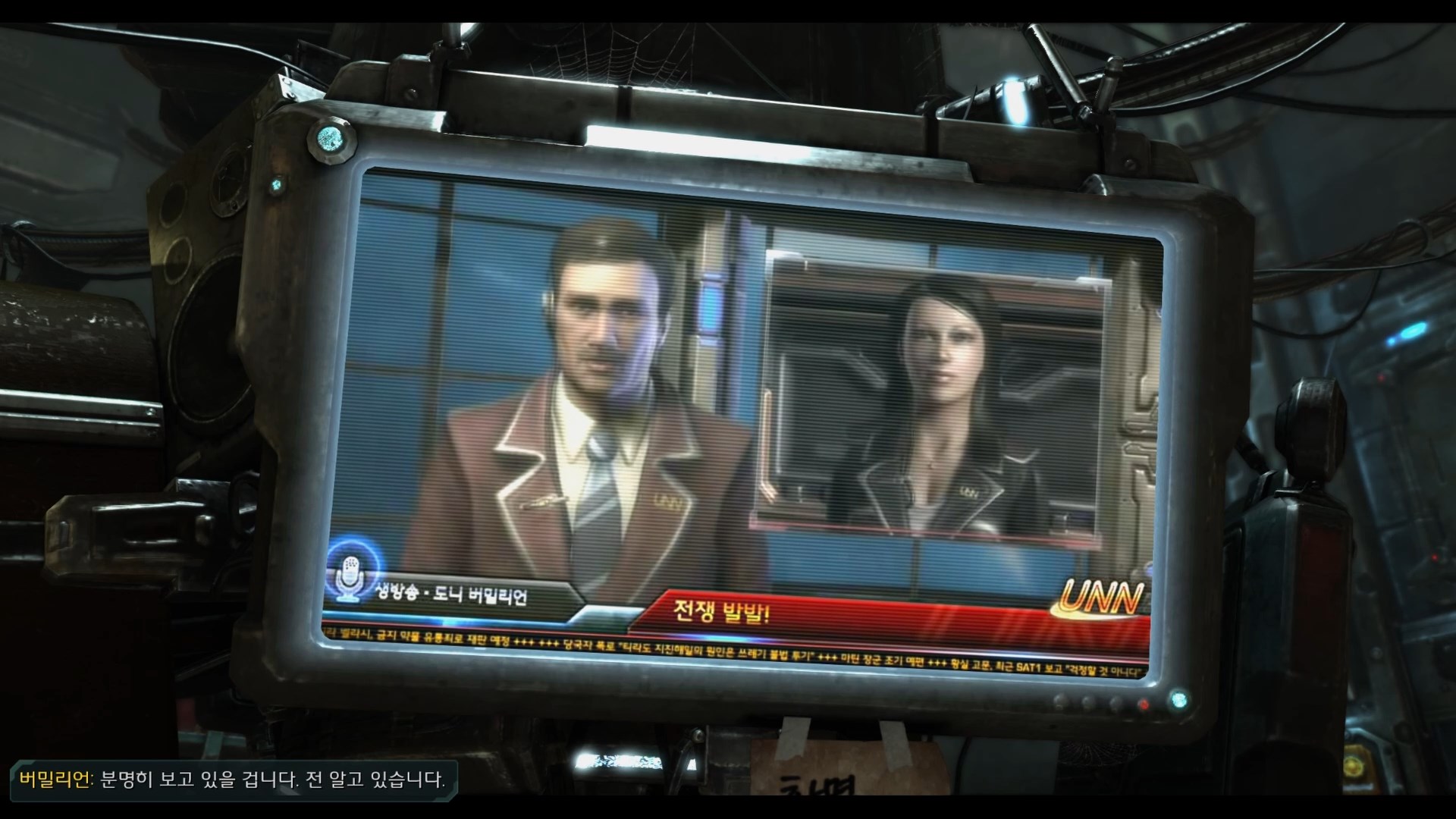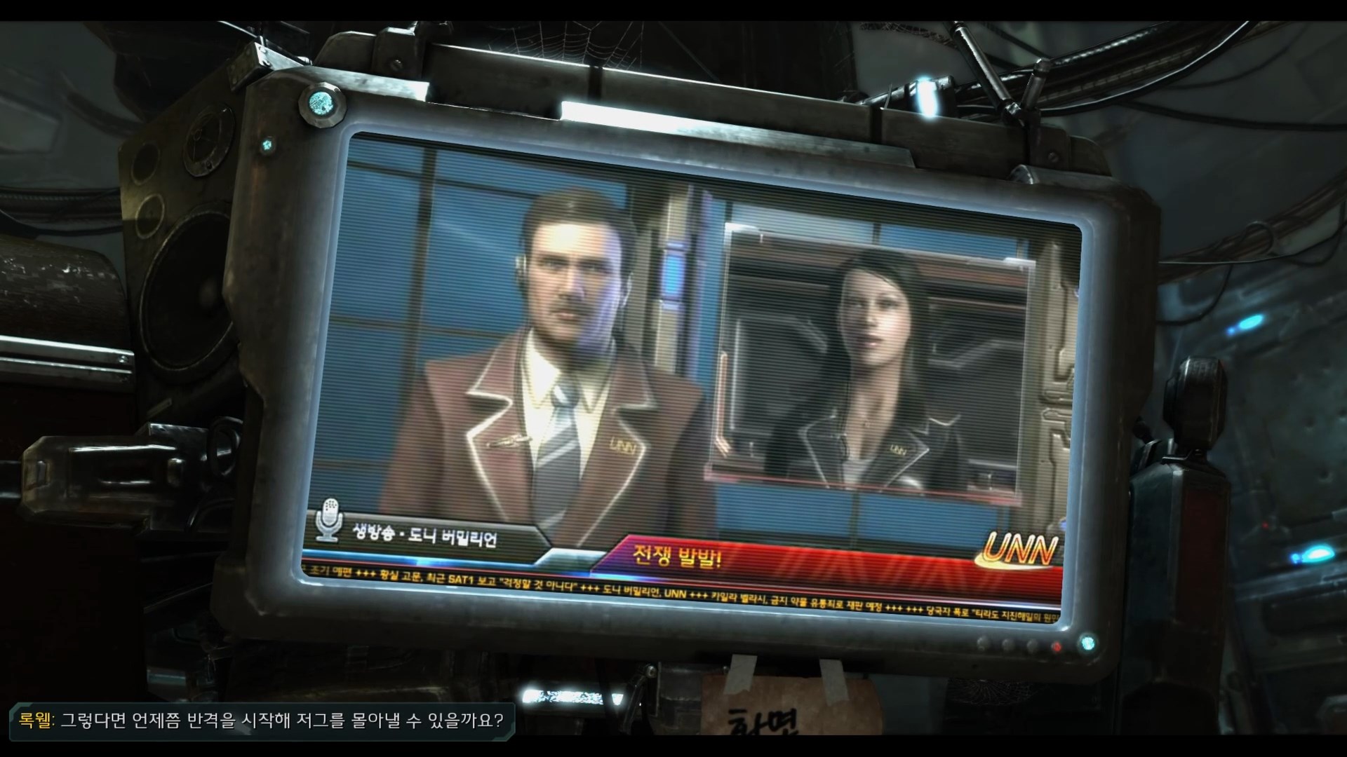 버밀리언 : UNN의 도니 버밀리언입니다. 오늘은 저그 침공에 맞서는 우리 군의 현재 전투 상황을 전해 드리겠습니다.