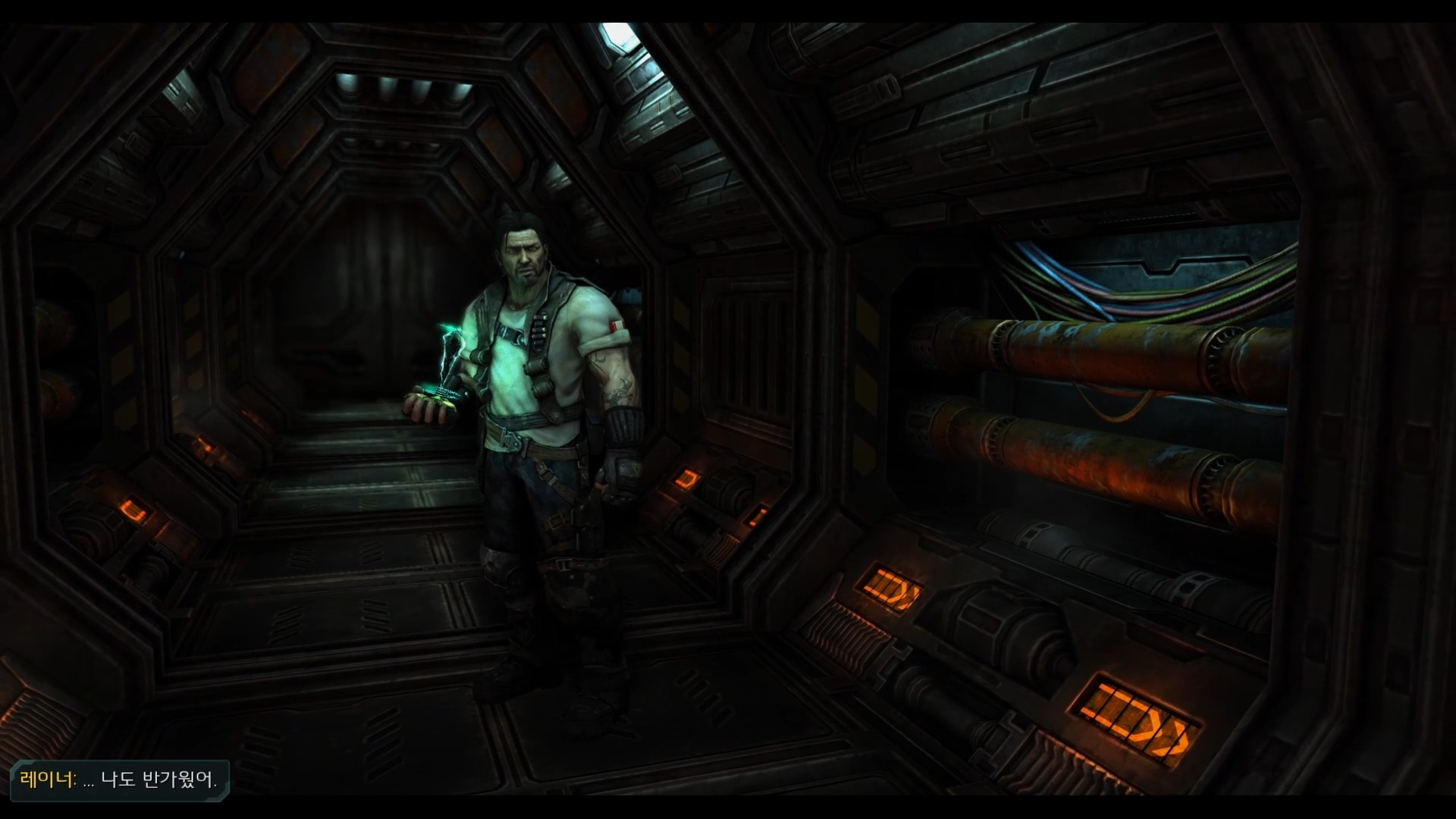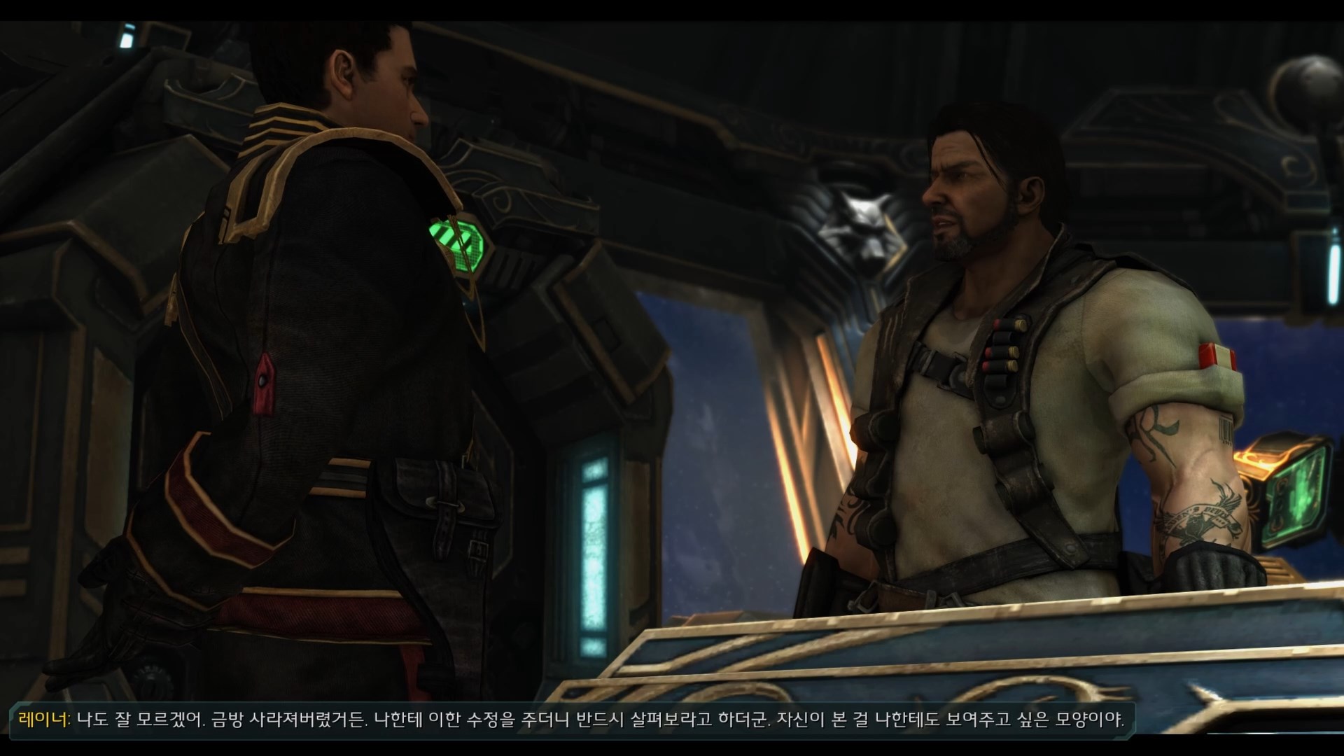 레이너 : 무슨 생각을 하고 있던 간에 조심하는 게 좋을 거요. 괜히 입 잘못 놀렸다가는 우주선 밖으로 던져버릴 테니까!
