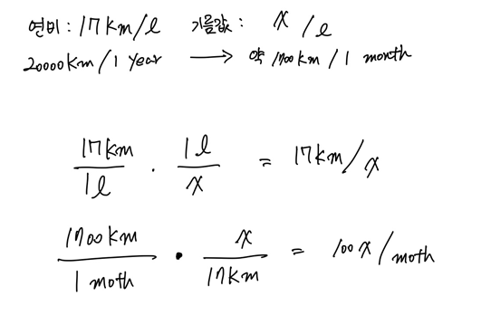 쨌든 대충 계산한 연비로 한 달 기름값을 대충 계산하면