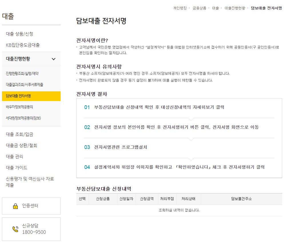 홈페이지 뒤져보니 담보대출 전자서명이라는 메뉴가 있어서 들어가 보았습니다.
