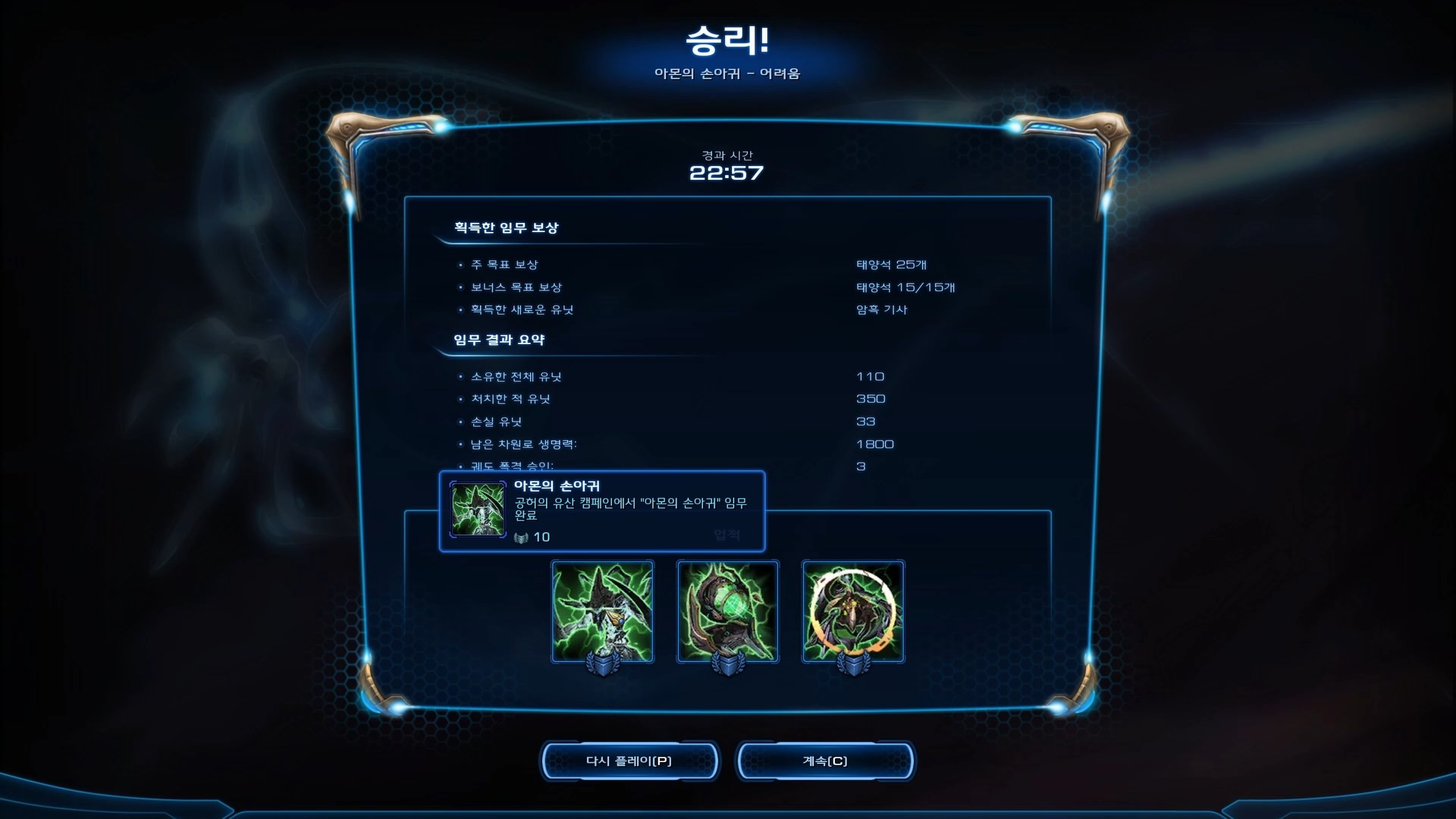 조기 퇴근 : "아몬의 손아귀" 임무에서 마지막 공허 분쇄자가 나타나기 전에 프로토스 발사대 모두 해방[보통 난이도]