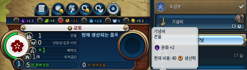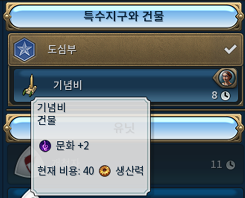 즉 기념비는 현 상태에서 짓기 시작하면 8턴 후에 완료가 되겠죠.