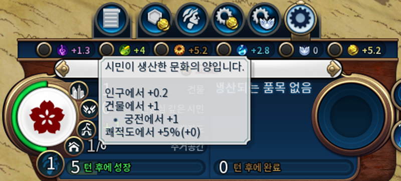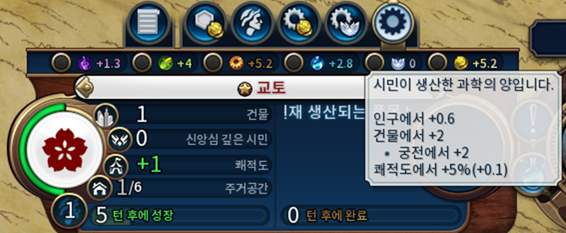 즉, 교토에서는 턴마다 문화 1.3, 식량 4, 생산력 5.2, 과학력 2.8, 금을 5.2를 생산합니다.