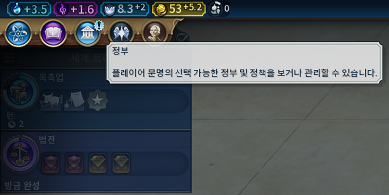 발전된 정부는 적용할 수 있는 정책 카드의 종류와 수가 많아집니다.