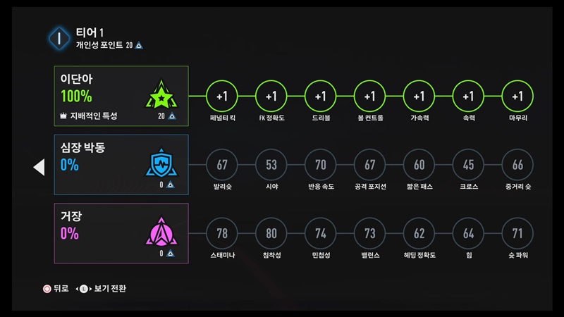 이단아 포인트는 드리블과 슛 카테고리를, 거장 포인트는 수비와 세트 피스에서, 그리고 심장 박동 포인트는 패스 카테고리 훈련을 통해 획득할 수 있습니다.