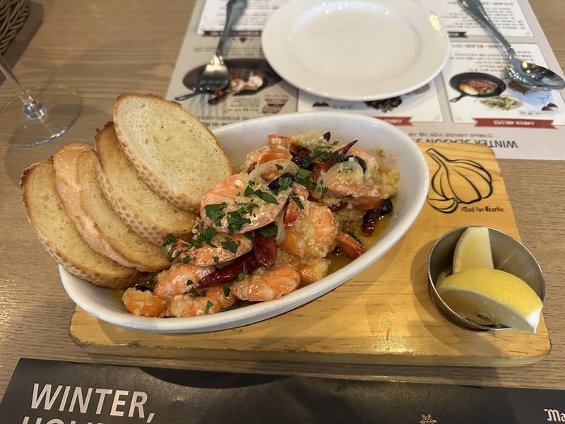 바닥에는 다진 마늘과 같이 볶은 것 같은 흥건한 올리브 오일, 같이 조리된 것으로 보이는 풍성한 새우들. 그리고 마늘빵으로 구성되어 있습니다.