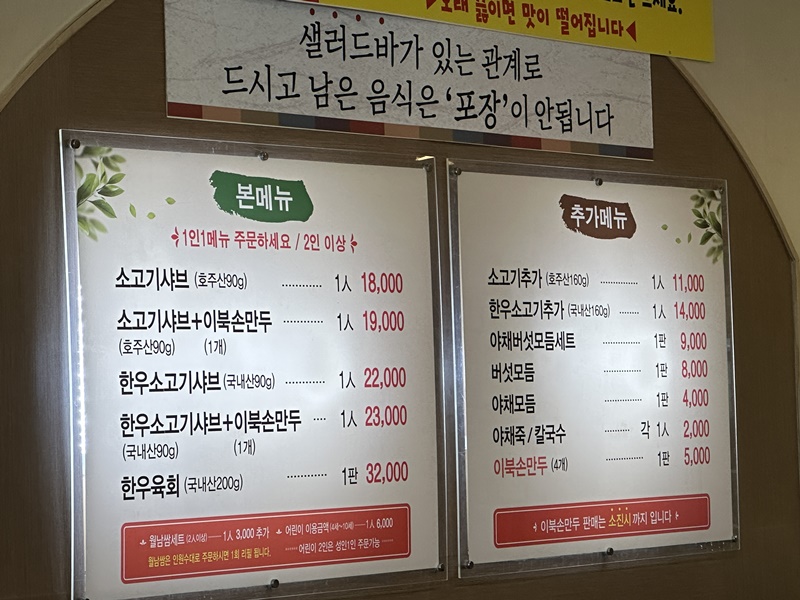 메뉴판은 간단한 편이고 특이한 게 이북손만두를 판매를 하는데, 사장님이 이북분이신가 봅니다.