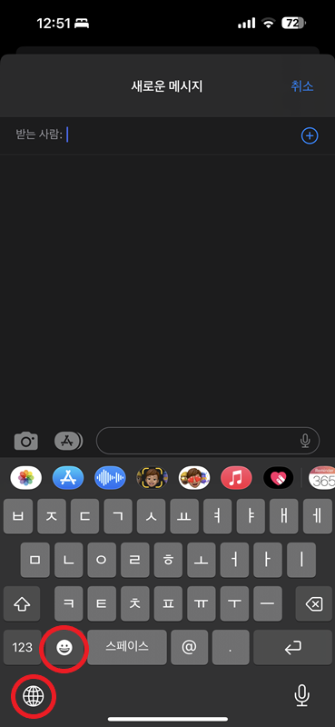 갤럭시에서는 한/영 변환 키가 위치해 있는 부분이 아이폰에서는 이모티콘 버튼입니다.