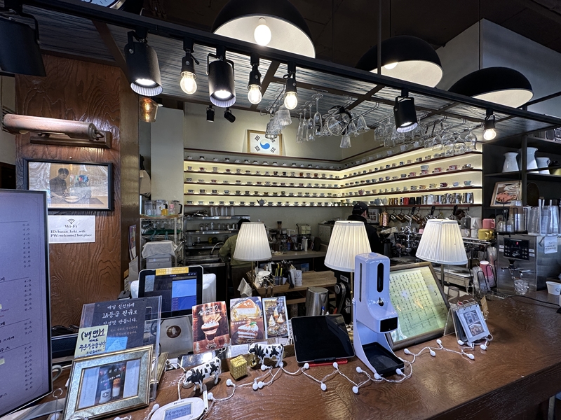 입구를 들어서자마자 카운터가 보이고 안쪽 내부 공간에는 다양한 컵들이 근사하게 전시되어 있습니다.