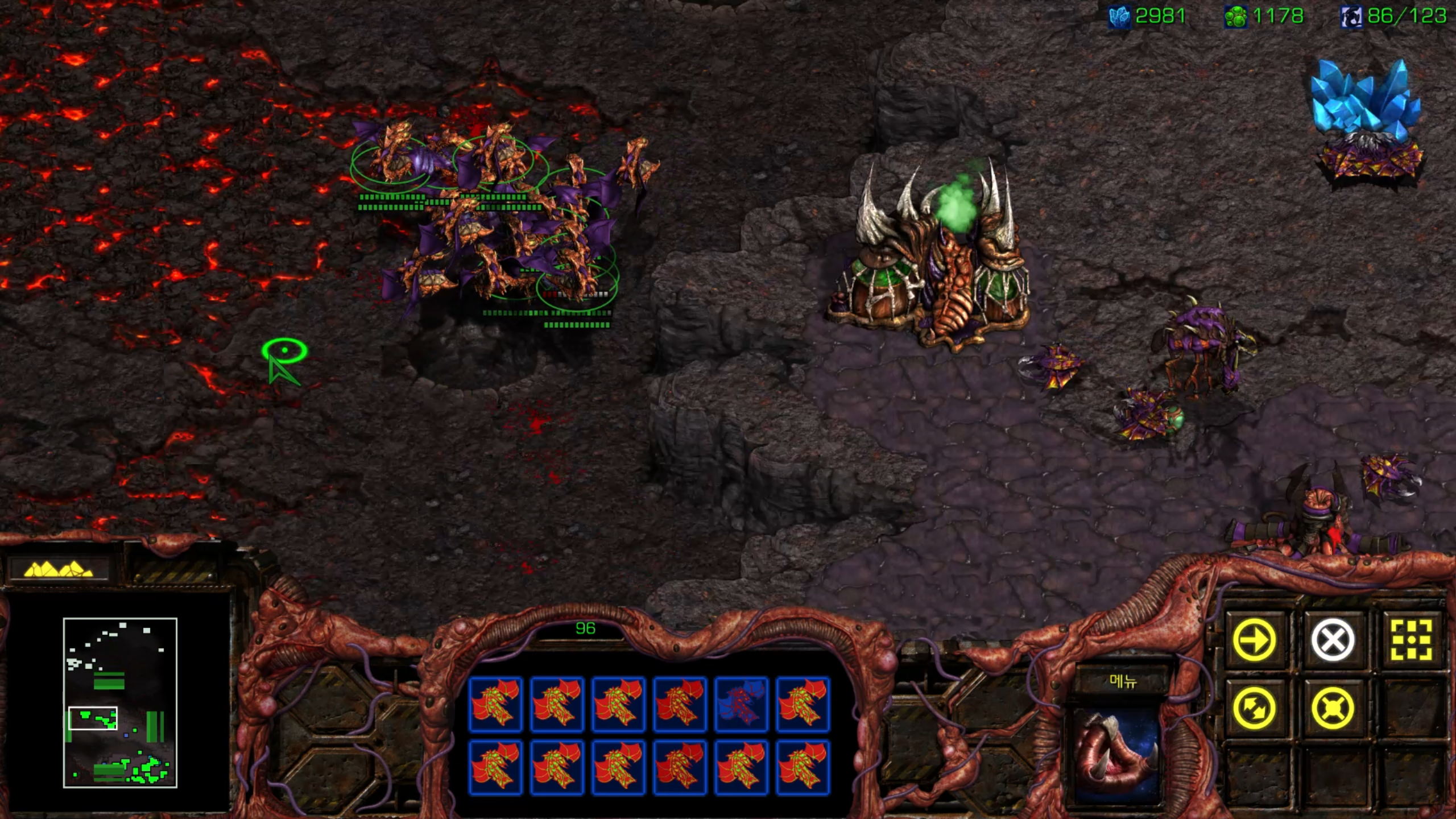 바로 위에 위치한 매우 좋은 가스 멀티에 테란 병력이 주둔 중이어서 저글링을 보내 이 지역을 확보하겠습니다.