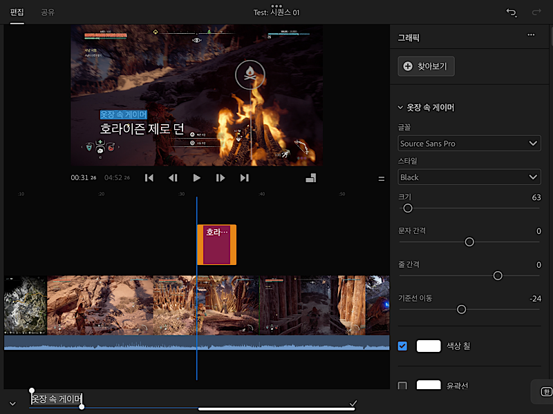 먼저 그래픽은 트랙 위에 다양한 효과나 자막을 삽입할 수 있는 기능입니다.