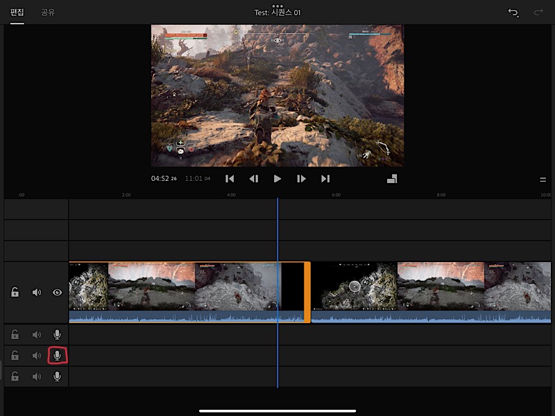 신규 트랙을 추가하게 되면 상단에는 미디어 트랙을, 하단에는 오디오 트랙이 생성되는데, 실시간으로 녹음도 가능합니다.