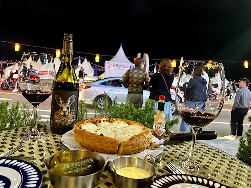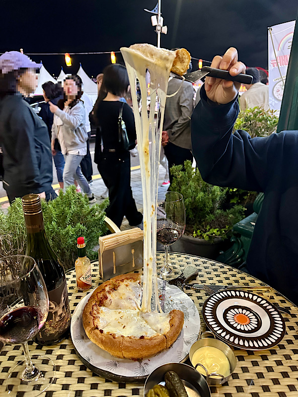 밥보다 비싼 와인 한 병과, 치즈가 엄청 땡겨서 치즈가 그득해 보이는 피자를 주문했습니다.