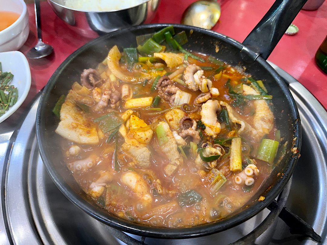 낙지, 삼겹살, 새우 전부 식감이 다 살아 있고 익힘 강도도 아주 완벽하고, 그 본연의 맛을 양념이 완벽하게 서포트해줍니다.