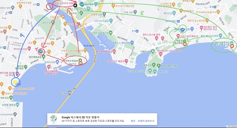 숙소에서도 가깝고(차로 5분 정도) 걸어서 광안리나 민락수변공원을 갈 수 있는 위치에 있습니다.