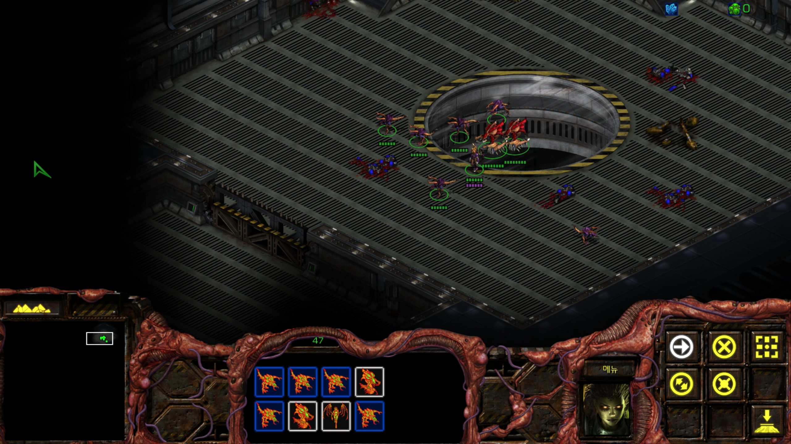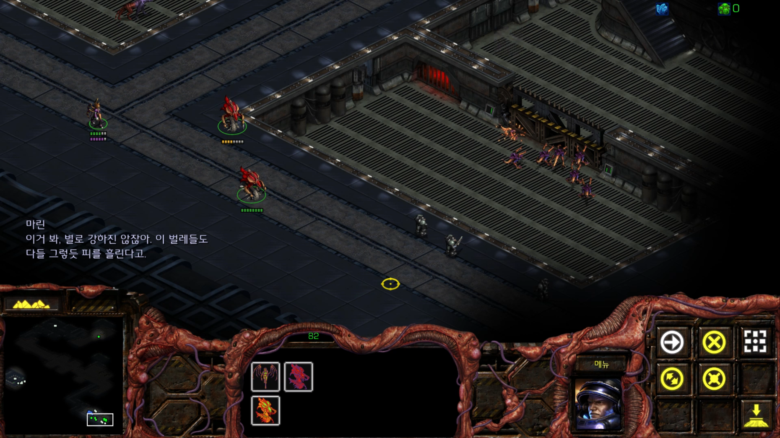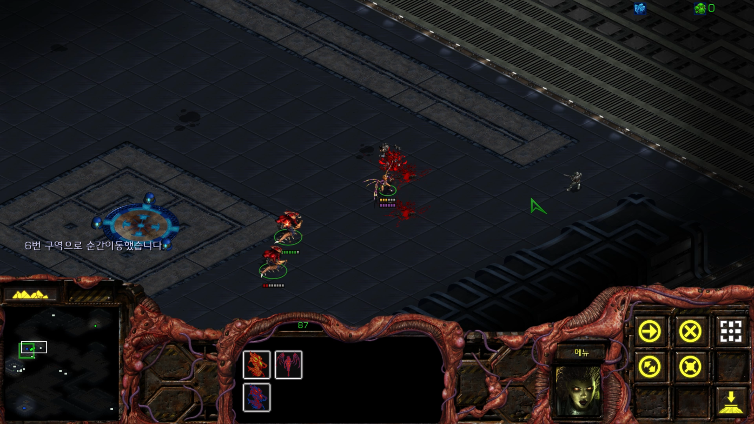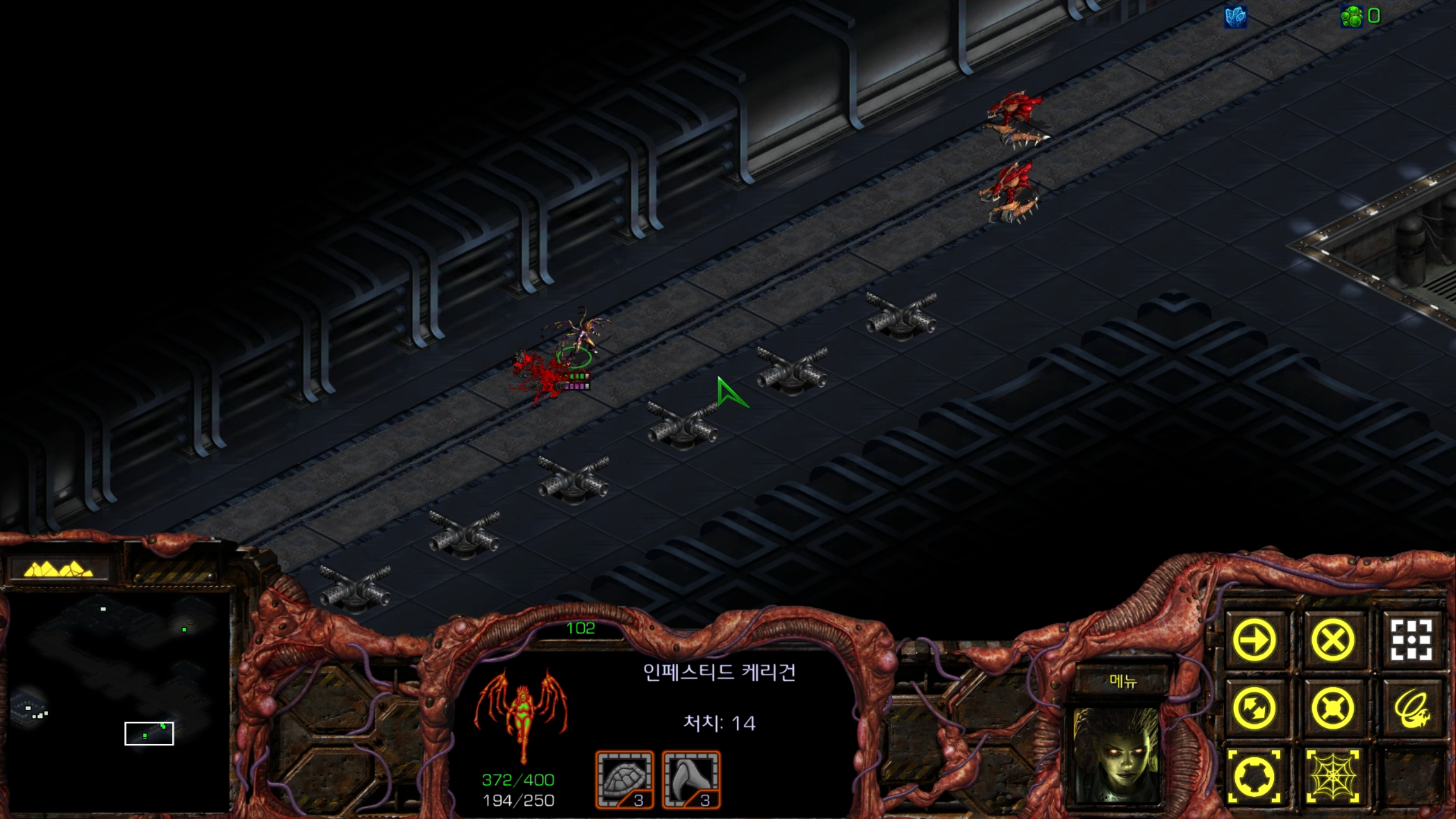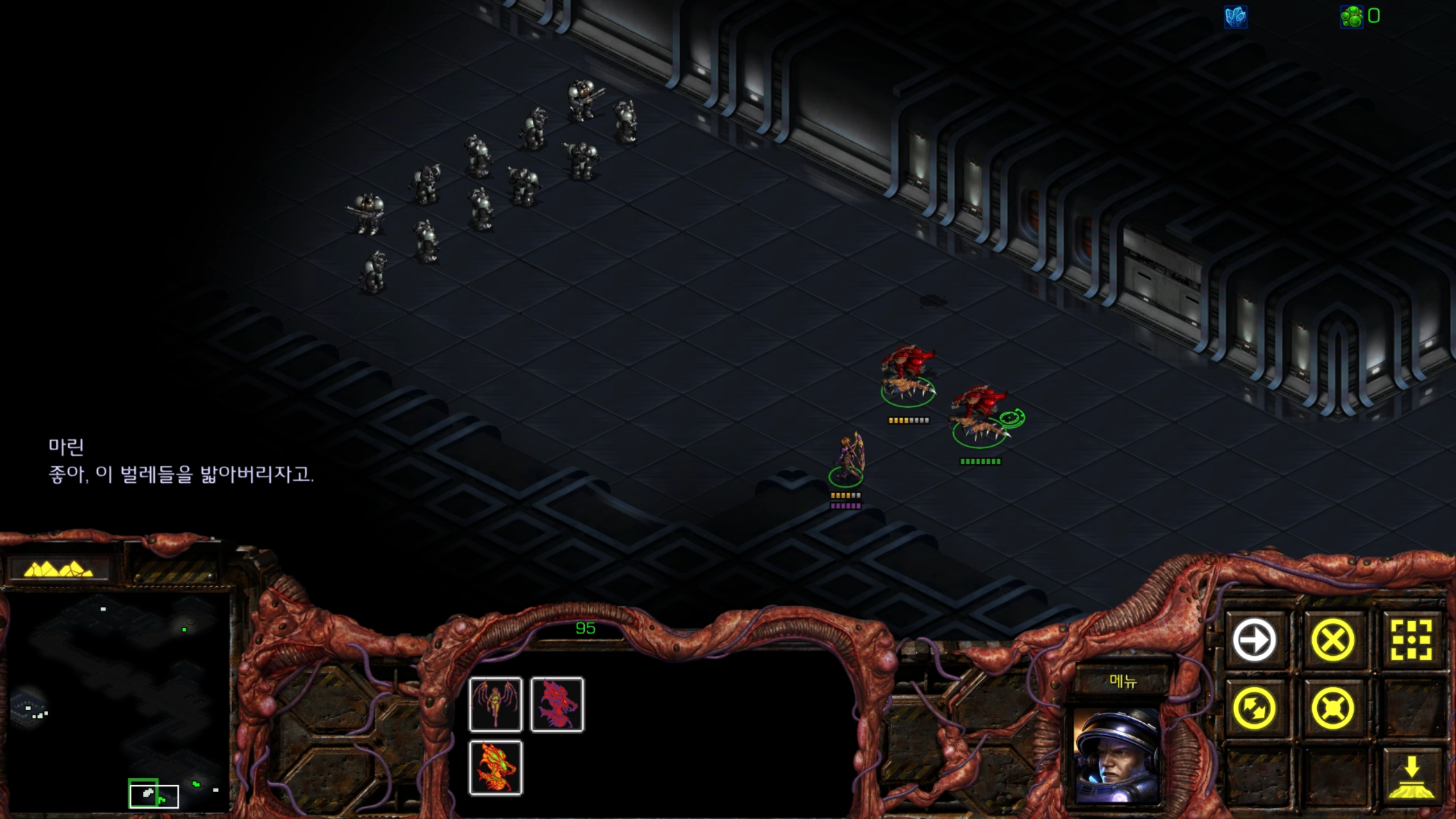 아래에는 저글링 네 마리가 있습니다. 헌터킬러를 최대한 보호하는 방향으로 활용해야겠습니다.