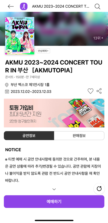 임영웅 콘서트는 이미 끝났고 1인 2매 제한으로 다른 공연을 예시로 들어보겠습니다.
