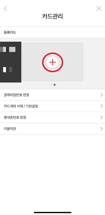 카드를 등록하는 화면에서 + 버튼을 터치해서 카드를 등록해 주세요.