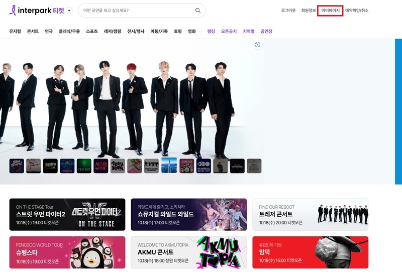 인터파크티켓 홈페이지에 들어가셔서 로그인을 한 다음에, 상단의 마이페이지에 들어가 주세요.