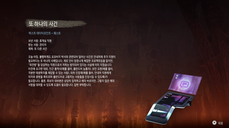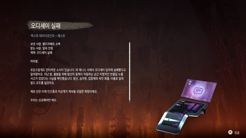 적들을 처리하고 안쪽으로 들어가면 엘리자베트 소벡의 홀로그램을 볼 수가 있습니다.