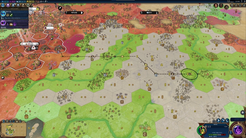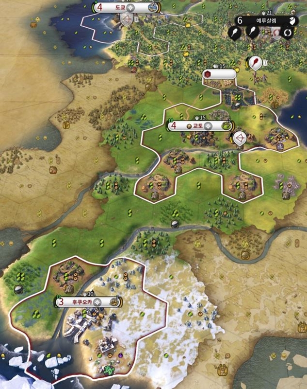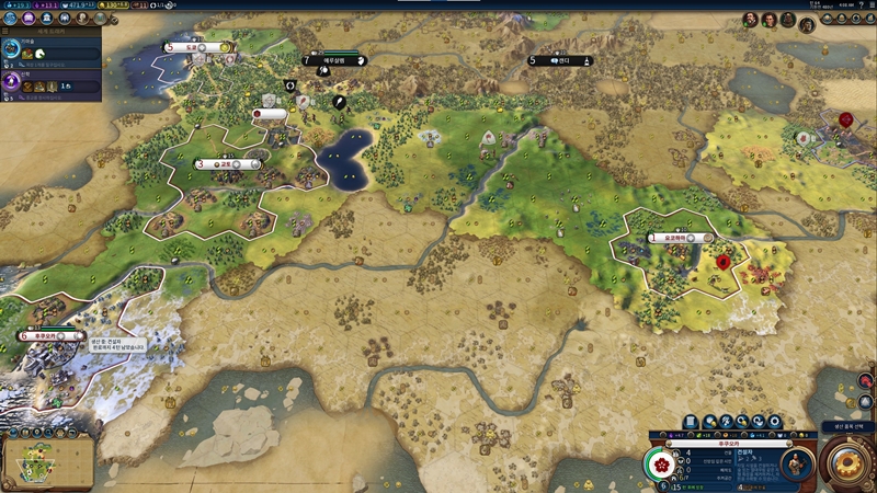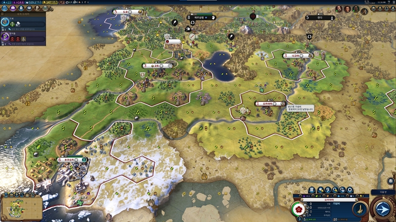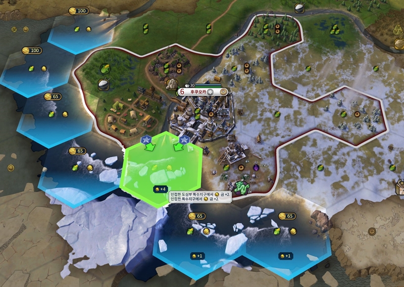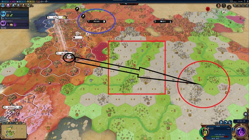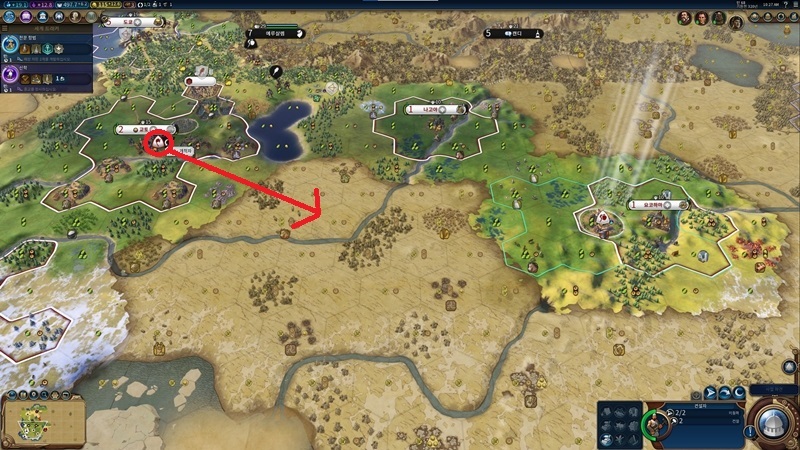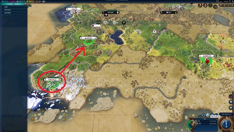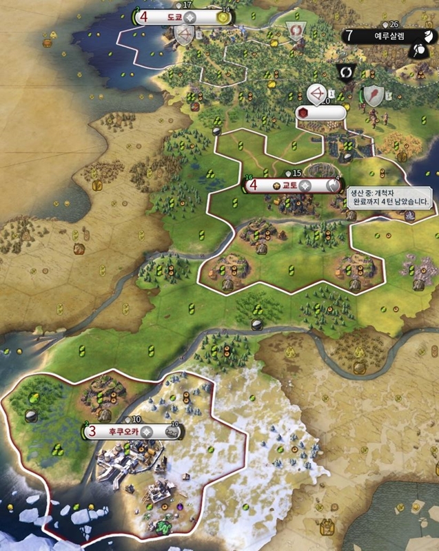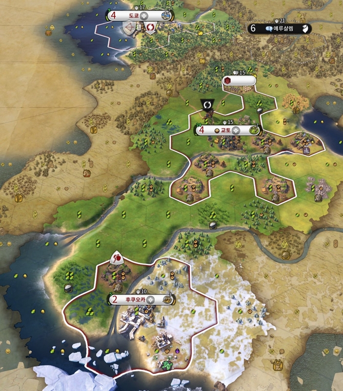 이전에 종교관으로 툰드라 보너스를 골랐기 때문에 전쟁으로 북쪽을 뚫는 것보다는 이쪽을 확보해 안정적인 내정을 굴리는 게 무난해 보입니다.