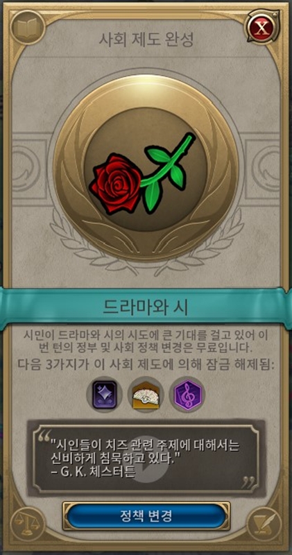 현재 상황 기준 두 턴 이후 스톤헨지 완성 -> 드라마와 시 유레카이니, 2+(11/2) = 7~8 턴 이후에는 정부나 정책 변경이 가능해지겠네요.