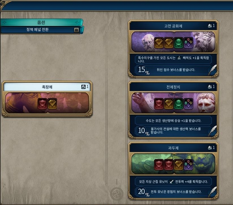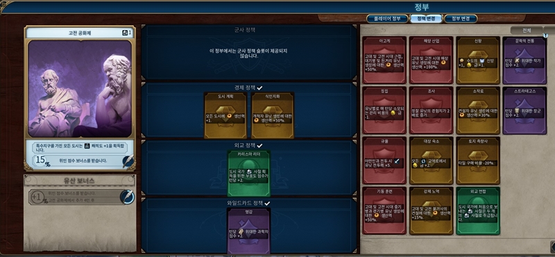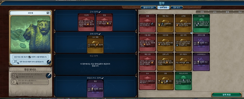 기존 족장제가 군사와 경제 각 1 카드, 총 2 카드의 정책만 사용가능한 반면, 해금된 정부는 총 4개의 정책카드를 사용할 수 있습니다.