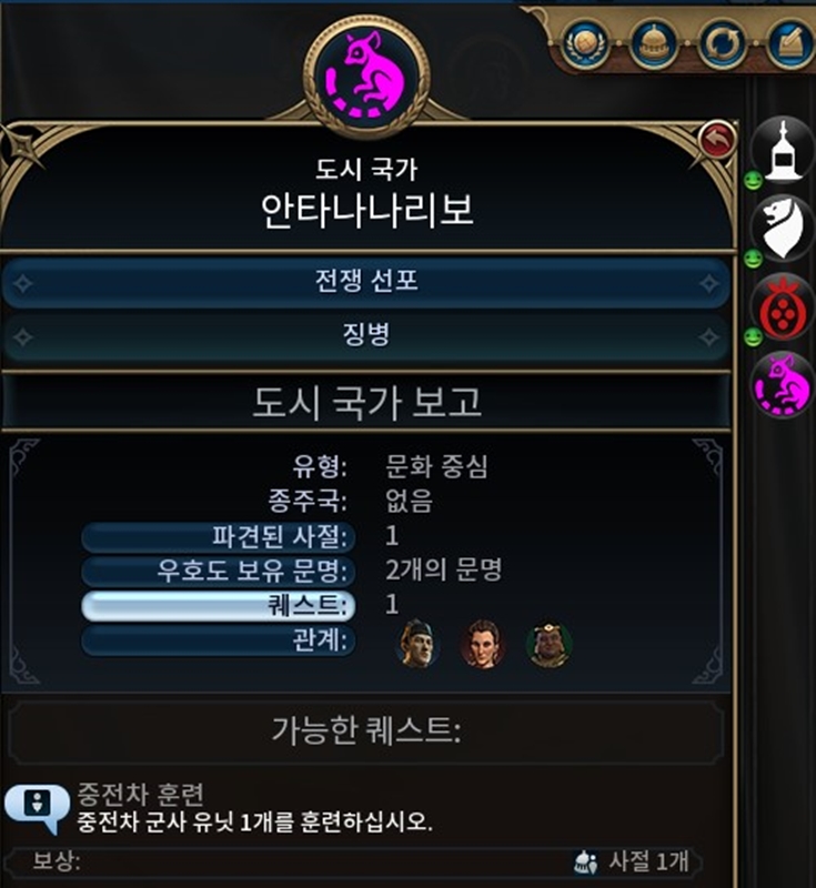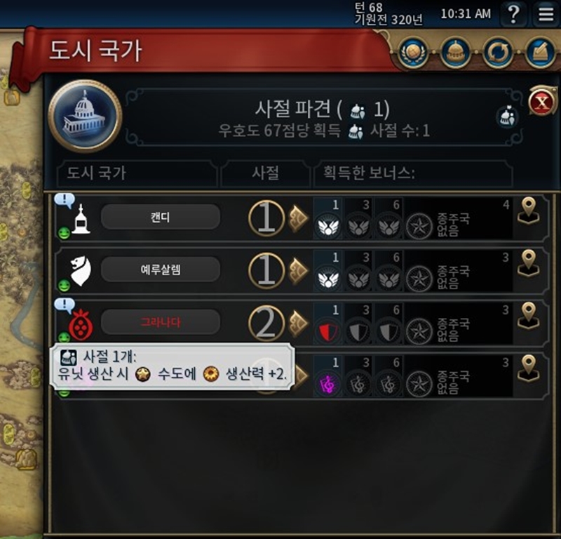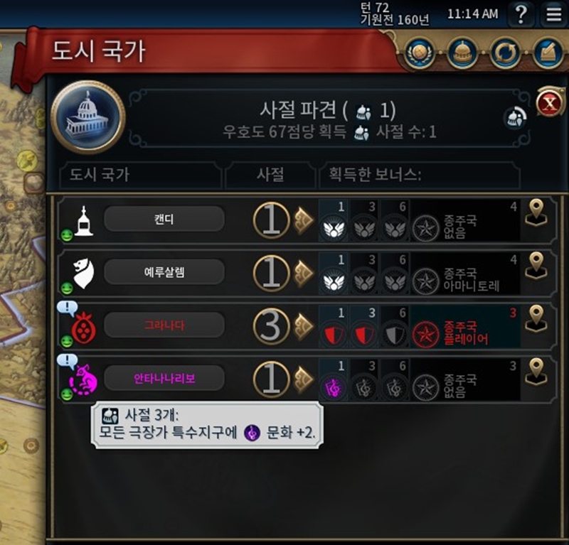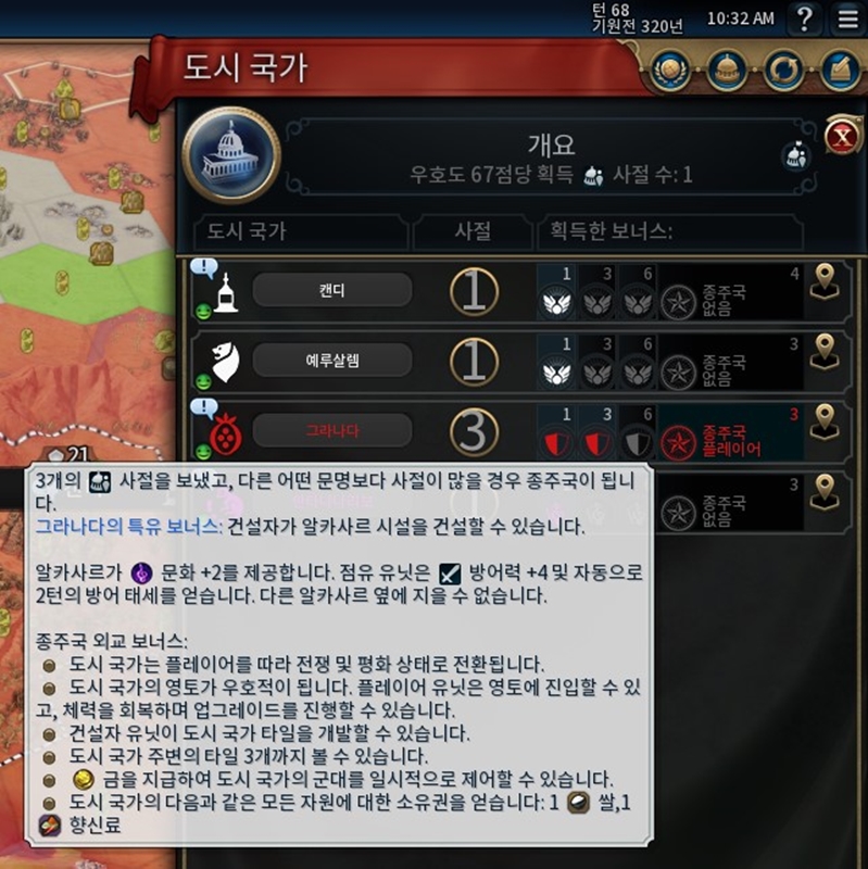 도시 국가를 종주국으로 삼으면 다양한 보너스와 이득을 얻을 수 있는데 기본적으로 나와 전쟁하는 문명과 전쟁을 하는 특징이 있습니다.