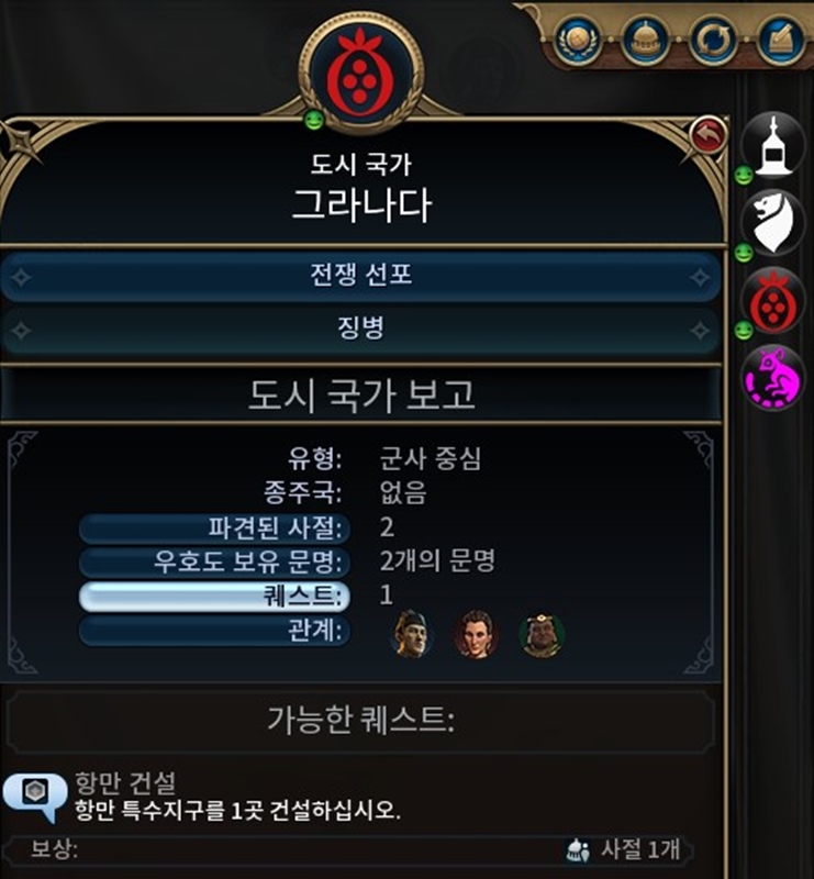 외교 정책 슬롯이 없는 게 좀 아쉽긴 한대, 그라나다를 이미 종주국화 해서 당분간은 사절이 크게 필요하 없을 것 같습니다.