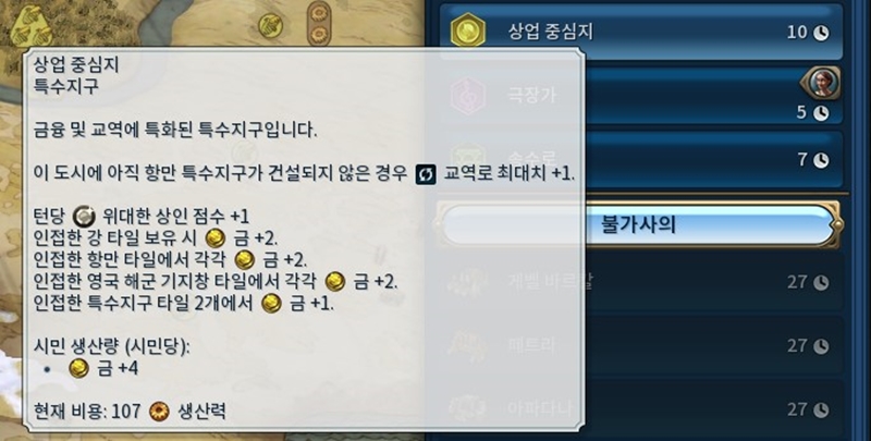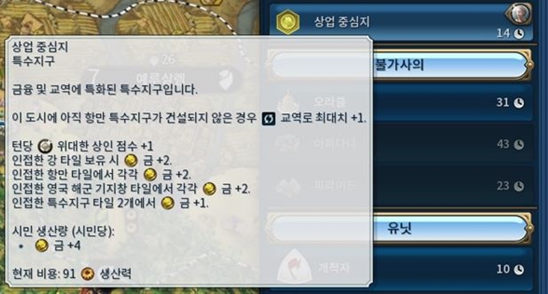 바다의 상업지구라고 이해하시면 되는데, 유닛의 바다 진출 시 이동력 보너스도 주고, 군사 관련해서도 여러 가지 이점이 있는 바다상업과 해군력의 하이브리드 정도로 이해하시면 될 것 같습니다.
