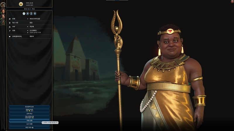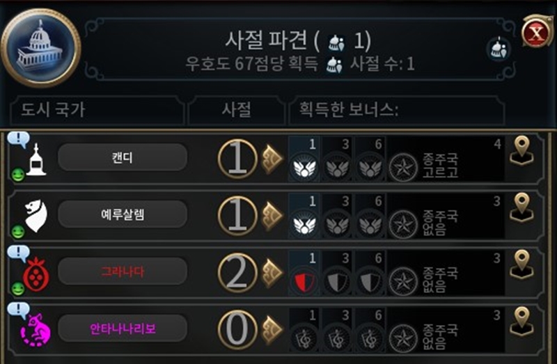 카리스마 리더 : 도시 국가 사절 획득을 위한 우호도 점수가 턴당 +2