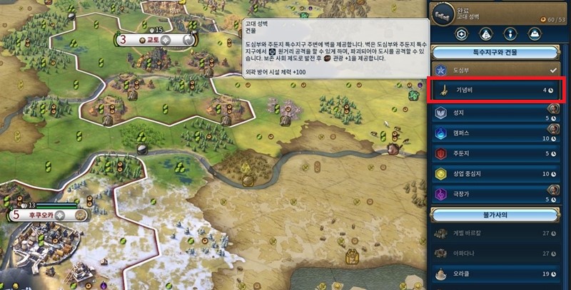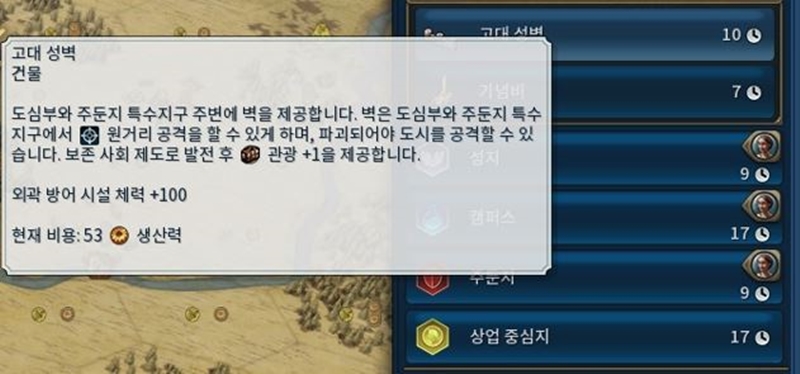 성벽은 기본적으로 도시의 방어력을 올려 주는 효과가 있고요.