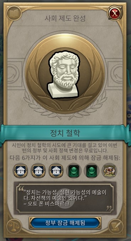 초반 가장 중요한 사회 제도인 정치 철학이 드디어 완성되었습니다!