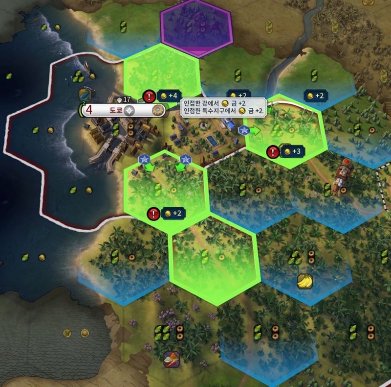 상업 특수지구는 강에서 금+2를, 그리고 주변 특수지구 2개당 +1을 주는데 메이지 유신특성으로 뻥튀기가 되었네요.