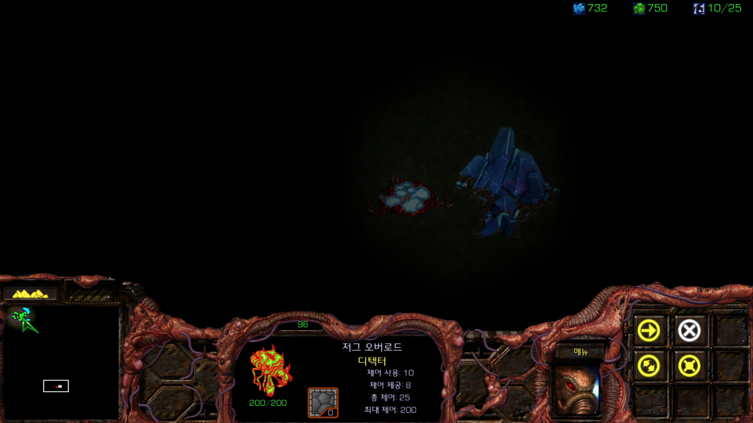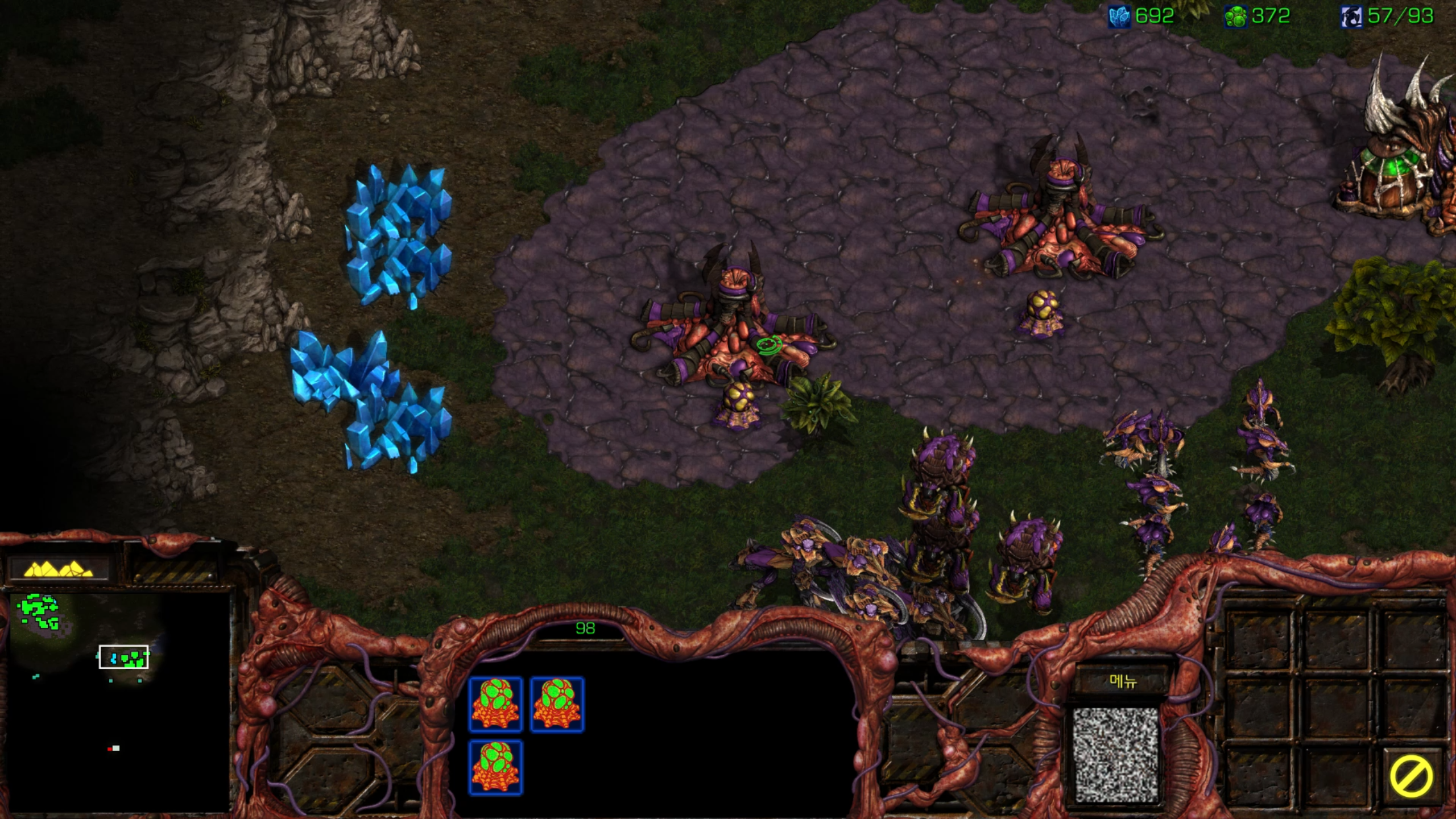 게임이 시작되면 역시 미네랄 위치 마음에 안 들지만 저그라서 괜찮습니다. 케이다린 수정의 위치는 미니맵 상에 보이는 중앙 하단부에 있는 것 같습니다.