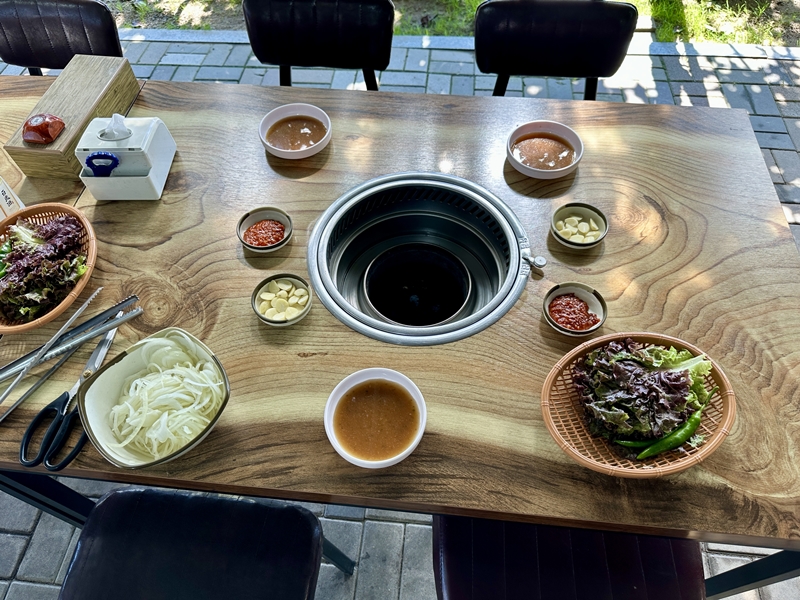 사장님이 알려주셨는데 보통 불판 위에 달린 연기 빼는 장치를 바닥으로 설치해서 연기를 밑으로 빼게 해놨다 하시더라고요.