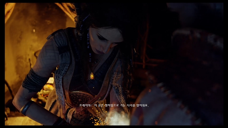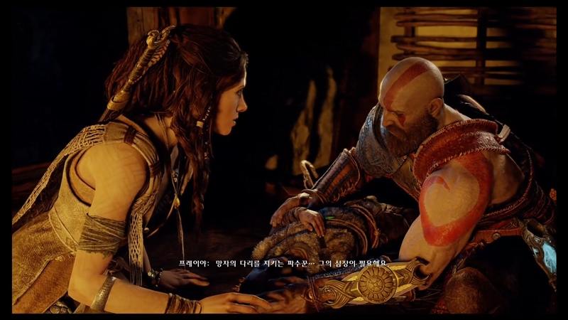 아트레우스를 치료하기 위해서 헬하임에 있는 망자의 다리를 지키는 파수꾼의 심장이 필요하다고 말하는 프레이야.